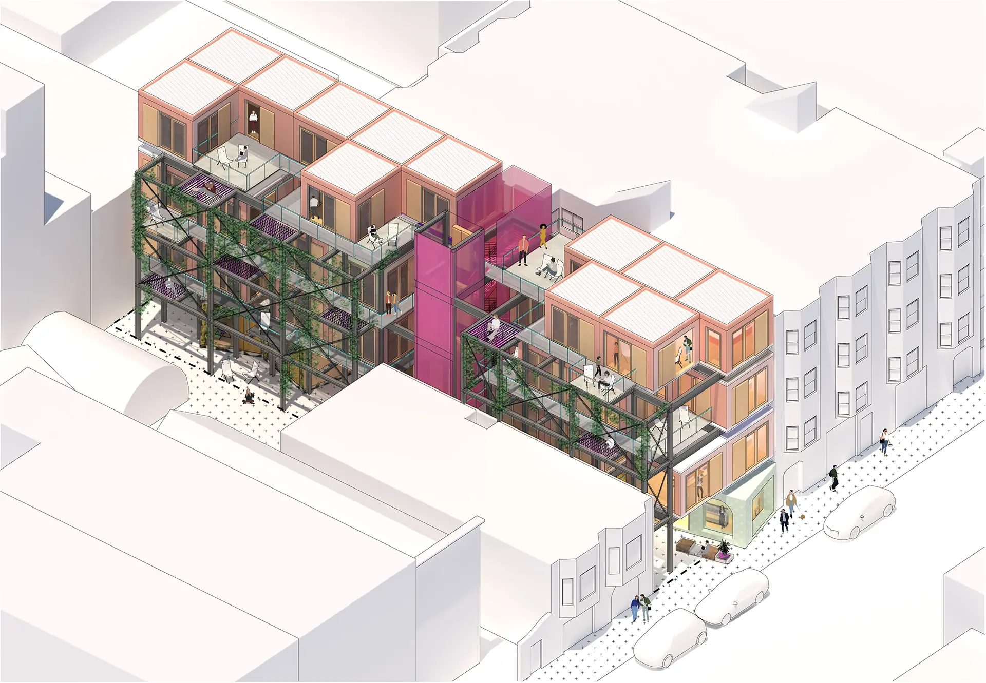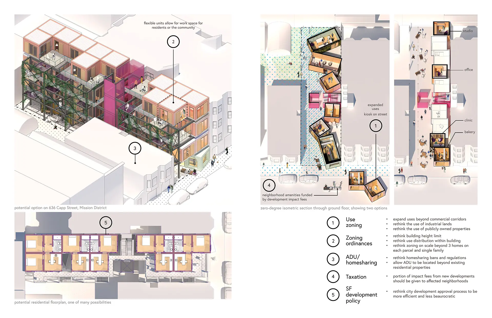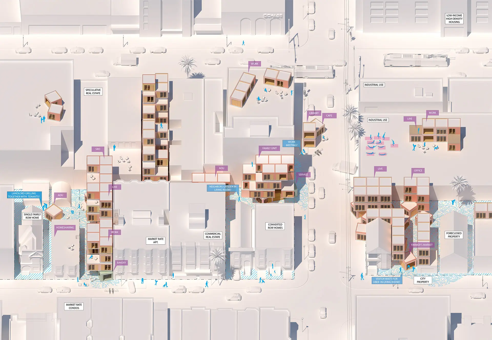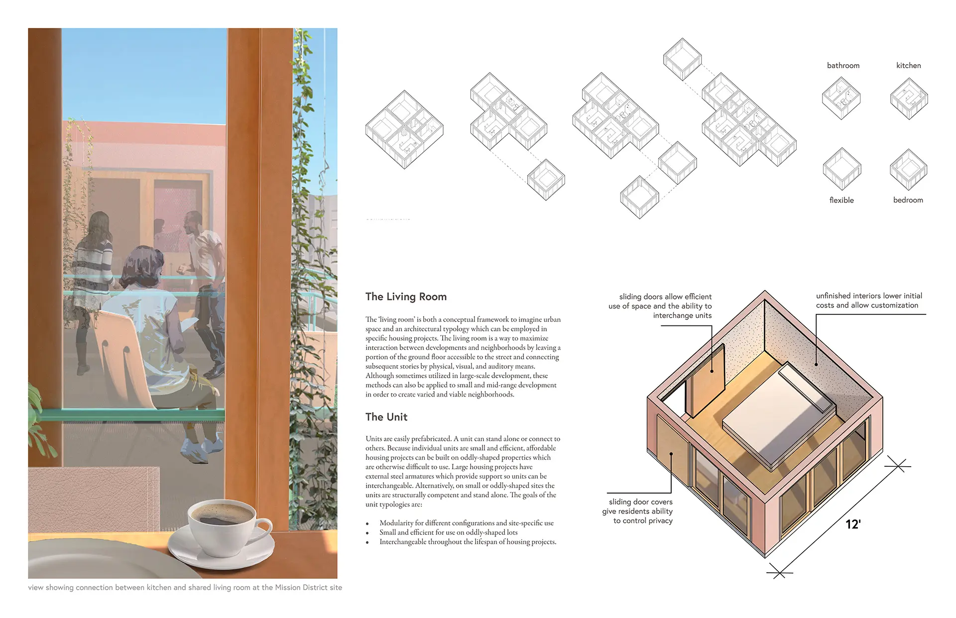 This project challenges anti-development culture, existing development and housing policies, and traditional housing typologies with the intention to create a fluid, resilient, and equitable housing market in San Francisco. The Living Room project offers the following strategies: